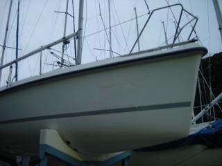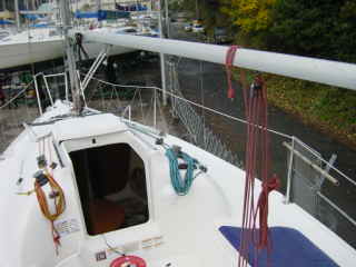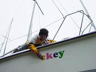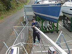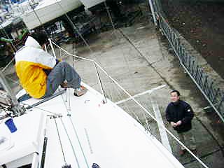 | その後、マスト立てにチャレンジ。 ウインチを使えば2人でもいけるかと思い! LET’S!チャレンジ。 が、上がらない。。。。 フォアステーの根元にもテンションがかかりすぎて歪んでいる。 美人新妻にウインチを巻いてもらうがビクともせず。 そこにハーバーマスターが!! お手伝いをしてもらう!! 男3人プラス美人新妻で何とか立った。 サイドステーとフォアステーを軽くしめてバックステーなど取り付け。 ブーム&キッカー&メインシートなどもすべて取り付け。 |