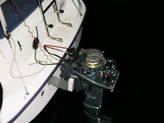 航海灯も無事に付いたし船内の配線も完璧 水に浮かべるとついつい出したくなってしまう・・ 案の定、無謀にもちょっとだけ出してみますか!?と まぁ、湾内だけならと出してみる 左 赤く光っているのが付けたばかりの航海灯(両色) |