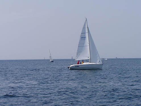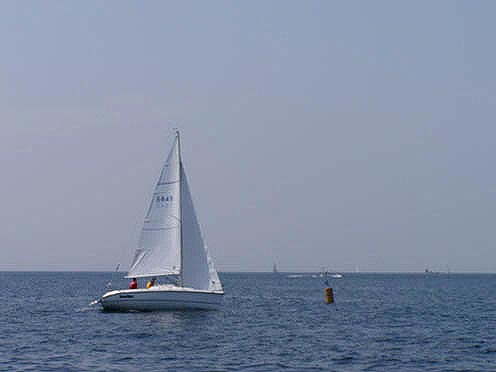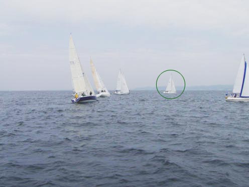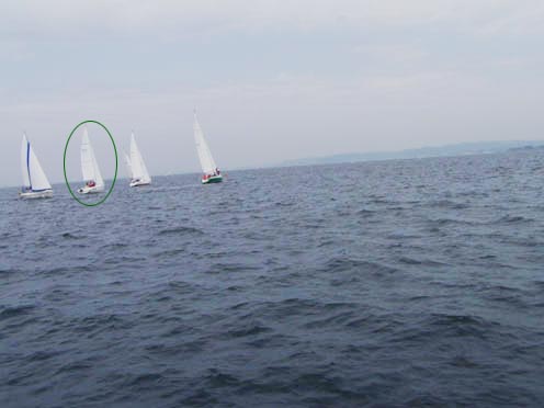 マークを回航するとO-windが前を行くF-windを「かもっちゃって〜!」と言っている。 「がんばりま〜す」と返事をしたものの全然追いつけない・・・ しかも、こちらはスピンも揚げていない。これで追いつけたら奇跡!? さすがにおまる号オーナーもスピンが欲しいとつぶやきだし、最終レグでジブチェンジもしたが… |