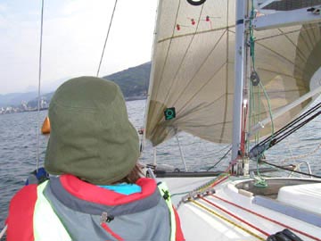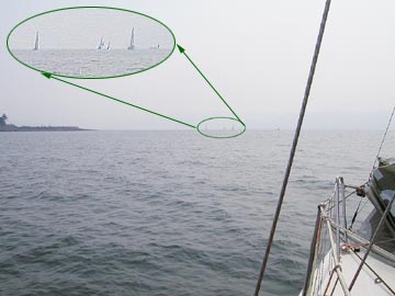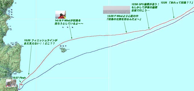 左・写真拡大図13時16分![]() おそらく3艇中、真ん中いるのがF−Wind。 どうも前を行きそうだ・・・ |