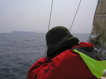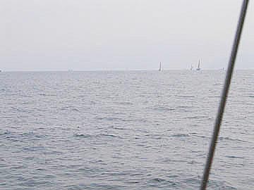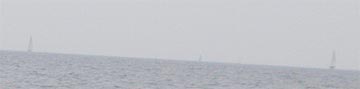 | 左・14時09分 初島と照美様 頭の左に先行艇あり 左下・14時32分 左から2艇目がF−Wind様。 ズド〜ンと走っていく。 下・同刻 判りづらいが艇団の前に出ているF−Wind様。 風も少し良くなり追いつける見込みがなくなってきた。 |