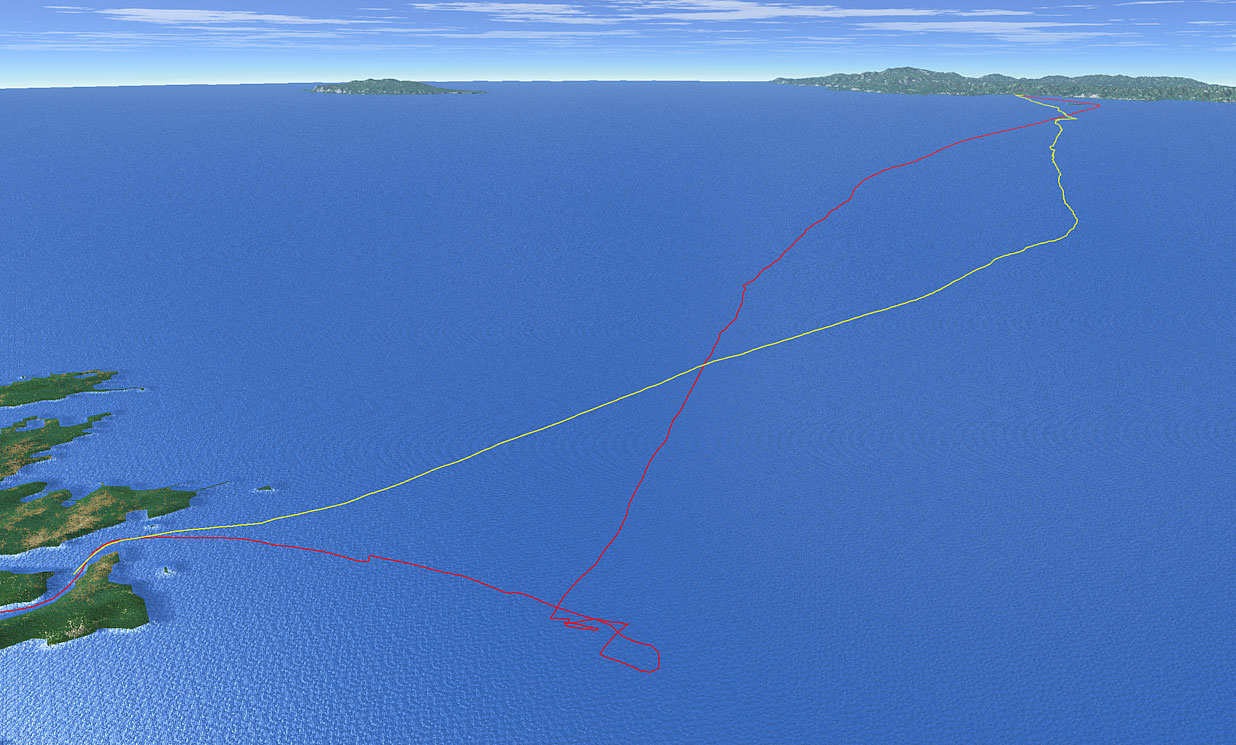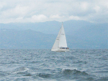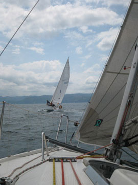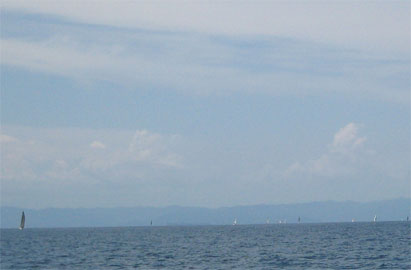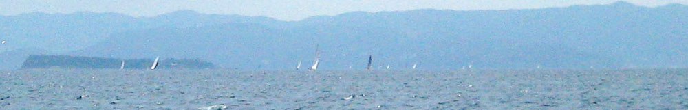 上:初島北側でこちらの写真を撮ってくれた飛天さん。 あっさりと抜き去られる。 左:飛天の奥はWINGS。(拡大図) |