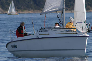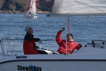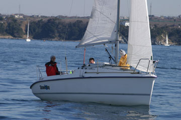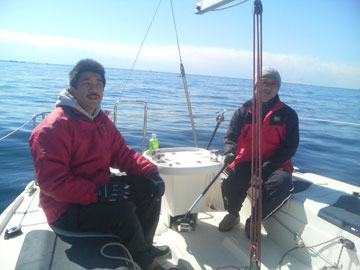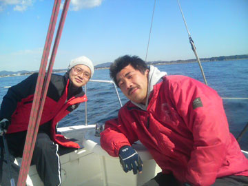 おまるBlogよりパクリ bakchosくん初しゃわーぼーい体験会。 午前中は風がほとんどなく、さわやかに晴れた空。 船を出すときにjibjibさんに 「いっつも雪とか降ってるときに船出してるから物足りないんじゃ なーーい??」 などと言ったくらいの穏やかな天気。 のんびりと、途中からは機走で城ヶ島へ。 途中、TKさんの船とすれ違いました。 お互いに写真を取り合ってさようなら〜。 昼ごはんを食べるべく一路城ヶ島へ。 城ヶ島はしぶき亭にてランチ。 岩のり、マグロ味噌などがお通しででてきた。 そこで問題発生。 飲みたい面々の帰りの車の運転。 「いいよー、じゃあ、じゃんけんで決めよう。」 私のこの不用意な発言が地獄を招きました。 試しじゃんけんでは一発勝ちしたのに、本番で負けました・・・。 恐れを知らぬ二人は生ビールをジョッキ2杯のみ、 完全に帰りの運転はできない状態に・・・。 一通り食べてご飯になったころ。 サービス品の岩のりのおかわりほしいよねー、 という話になり、 おばちゃんにbakchosくんがスマイルで 「これ、おいしいから、お代わりほしいなあ〜。頂戴」 とかわいくお願い。 おばちゃんは一回だけだよー、聞いてあげる♪と ・・・。 しかし、bakchosスマイル、おばちゃんの心は打ち抜いたが 厨房には届かず。 おかわり無理でした。 jibjibさんが外でとうもろこし購入し、フルコース終了。 帰りは宮川を見に行こう!と城ヶ島大橋をくぐり、宮川へ。 一通りくるっと廻って帰路へ。 かまねブイを越えたあたりから天気がものすごく怪しく なってきました。 風は8メートルくらい。雨もパラパラと。 かっとびで油壺へ。 油壺入り口でまたもやTKさんの船に遭遇。 お気をつけて・・・・ 入港したときには雪がちらちらと降っておりました。 行きがけに変なことをいうのではなかった。 そして、後片付けをして問題の帰り。 車の運転はほぼ1年ぶりくらい。 そして、車はjibjibさんのどでかいアストロ。 左ハンドル。 アクセル、どっちだよー。 ウィンカーってどこよ? ライト??そんな難しいこといわないでよー。 道幅の狭い目黒通りはさらに地獄でした。。。 前方にバス、「ど、どうする??」 2人「待つ!」 そんな声合わせて言わなくても。。。 まあ、助手席がなくなることなく、無事に帰り着きました。 写真提供:TKさん |
