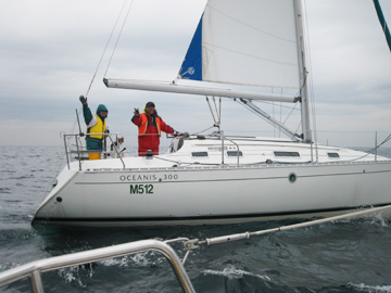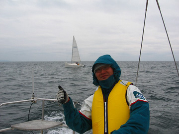 城ヶ島の港内でプカプカしていたら携帯が。 uzyからでいまそこに居ない?と対岸を見たら トランスパックの練習休憩中でした。 船は52ftだっけ!? uzyが乗るとあら、不思議。 普通のサイズに見える!? スピンポールがうちのマストより長い!? |