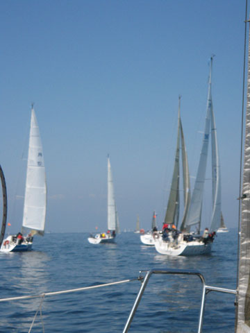どんどん風がなくなる。 1分前。 無風!?(笑) 全艇で漂う。 本部船からは「オールクリア」との声。 なかなかラインを通過出来ない… |