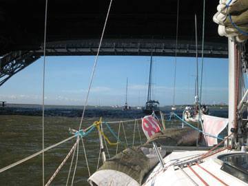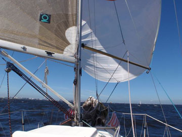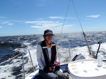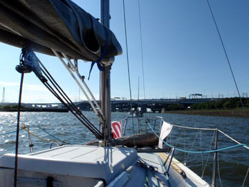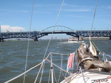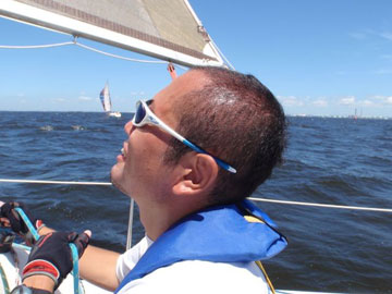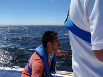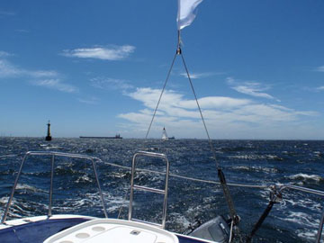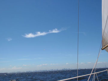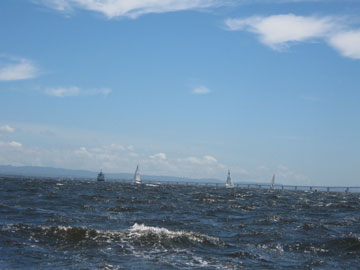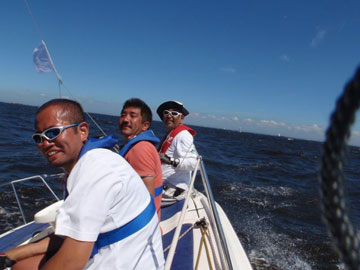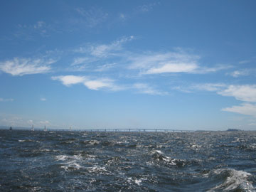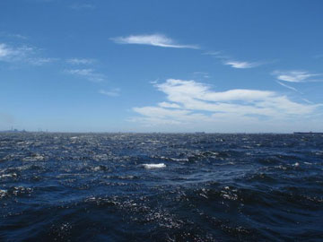 | 海面は、予想通り吹いている。 8〜10m弱くらいかな。 しかも、海ほたるに向うには、またもや嫌いな真上り… まぁ、気にしても仕方ないので船上は、和気あいあい。 |