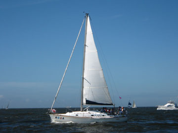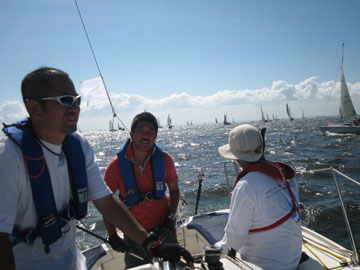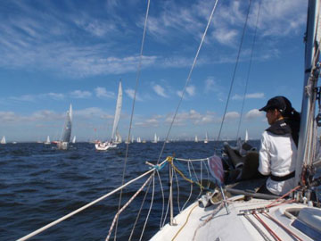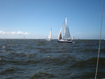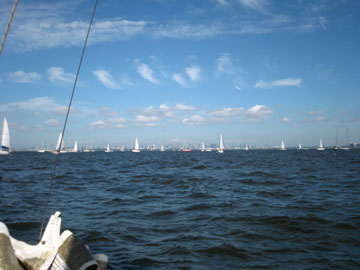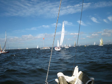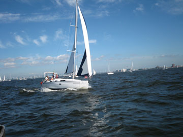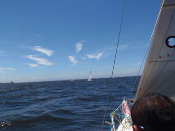 Aクラススタート。 Bクラスも10分後にスタート。 そして我々のCクラスもスタートの予定でしたが 回答旗が上がり結局、20分後のスタート。 どうやらBクラスでリコールがあったそう。 そのスタート待ちの際に 大工のKさん乗り込む船が戻って行く。 (詳しくは書けません…) デスマストした船も発生〜 結局2艇のデスマトがあったそうです。 我々は、全く無理もせず、ゆるくスタート。 マストを今のフォアステーいっぱいまでのばしたので 今までよりは若干、マシですがやっぱり上りは苦手。 京葉シーバス手前でおそらくY-23が高さで結構、前を行く。 旗の色が確認出来ない位先(笑) そうこうしているとAクラスの先行艇が海ほたるを回り出す。 皆の母船・赤い悪魔も回ってくる。 が、スピントラブル。 みるみるうちにフォアステーにスピンが巻かれていく。 あ〜あ〜と言いながら、明日は我が身と皆で言う(笑) |