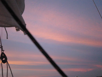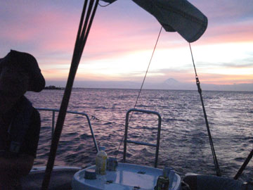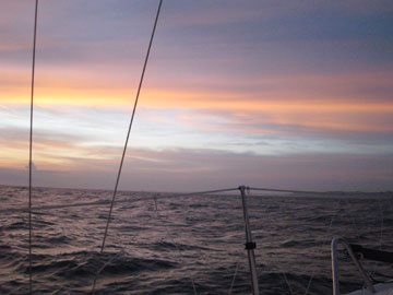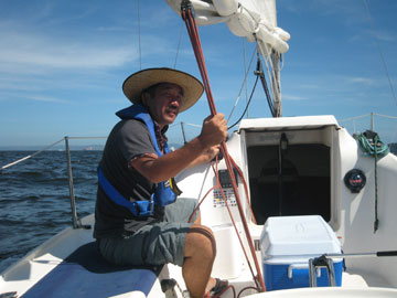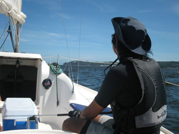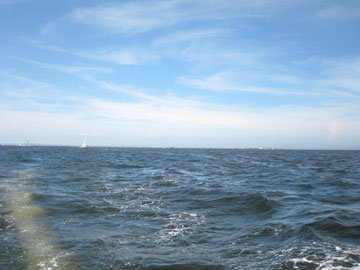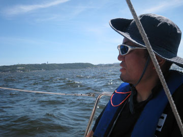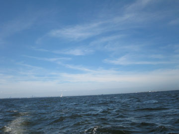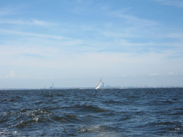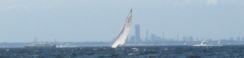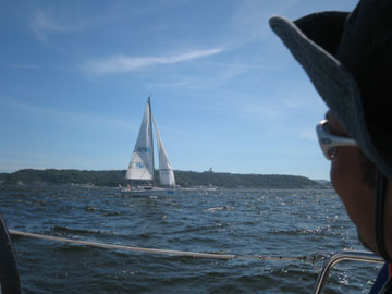 平和な夢の島をあとに… 8時40分出航。 やっぱり沖へ出ようとすると、 風は10mくらいで真向かい… 少しメインに風を入れながら走るが波に叩かれ、 艇速2〜3kt。 先が思いやられる。 まぁ、晴れているだけいいっか。 一方、早朝に出た昨日の優勝艇・若様は、 風無いよ〜早く保田においでと。 ぜったいに無理〜〜! |