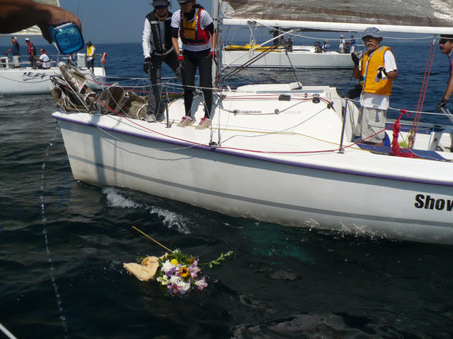 先日、油壺の仲間が急死した。一緒に壺を盛り上げていた仲間だ。 まだ、お通夜から一週間も経っていない。 半ば無理矢理、新婚の夫(喪主)であるじじぃを引っ張り出した。 スタート前に、uzyがレース委員長の独断と偏見で回答旗をあげて献花を行った。 江ノ島チームも面識のある人も無い人も、同じ仲間として献花にご協力下さった。感謝。 全体を代表して!?花束をおまるが捧げ、大好きだったボンベイサファイアも海に注がれた。 ![]() この日の為にサングラスは大きくした。 |
