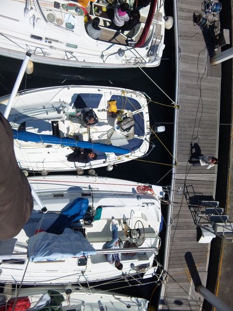| ねじはひとつははずれたようだが、もうひとつはムリ!と・・・ ここで、 「あれ?ダメじゃん、これ、 フォアステーがつながってる!」 えーと、スピンとジブハリがマストから出ているところが 調子が悪そうなので、外そうとしたらそこにフォアステーも一緒にくっついていたので、 これを外すと、もしかしたらjibjibさんは棒高跳びの選手のような アクロバティックなことが???? ということで作業中止。 |
