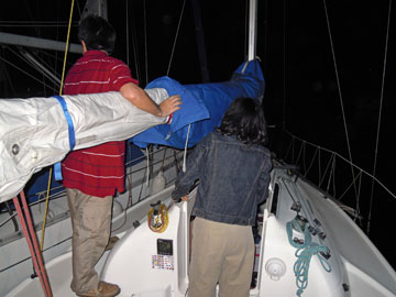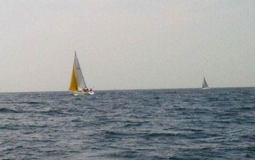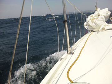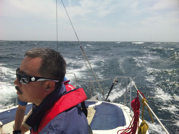 そんな中。 荒崎をこえた辺りで・・・ あらなんと、uzy率いるウィングスに追いついた! もう一言、言うならば、追い越した! 「なんかウィングス遅くない〜?」 「釣りでもしてんじゃないの?メールしてみよっか、何釣れた〜って・・」 「いや、きっとuzyが中で寝てんだよ」 などと話していると、 途中から急にスピードが出て先に行っちゃった ・ ・ ・。 あとから聞いたらどうやら藻がひっかかってたらしい。 それでも、順調にすすむしゃわーぼーい。 しかし、だんだん、風と波がひどくなってきた。 最初は「はい、波〜!波〜!!」とゆうゆと楽しくコールしていたけど だんだん、そんな場合じゃなくなってきた。 よしさん「ゆうゆ、中入って!」 城ヶ島手前で横倒しになったまま城ヶ島に吸い寄せられる〜。 あ〜れ〜・・・・。 とりあえず、リーフ入れよう! しかし、波にたたかれ、船はとまりコントロール不能状態。 jibjibさん「おまる、どうする〜? まあ、ジブチェンジしたりすればレース続けられなくはないけど。」 |