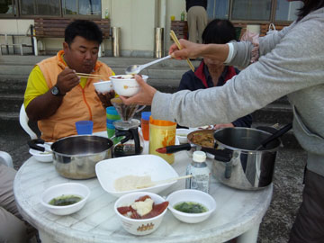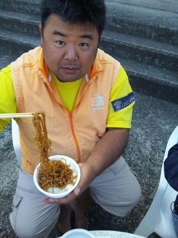 日曜日♪ みんなで朝ごはん。 かーちゃんの作ってくれたサラダ、味噌汁、 前日のマグロの刺身の残りを漬けにして作った山かけ丼。 jibjibさん作やきそば。 なぜか、ご飯の上に焼きそばを載せて 「やきそば丼」にする人もあり。 以下、割愛。 |