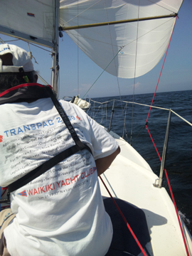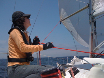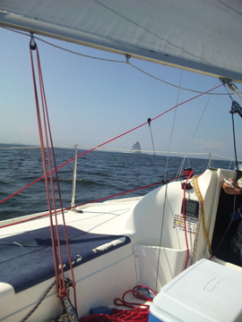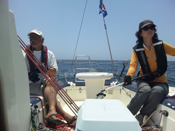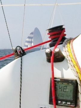 12:00 第二海保手前で、風が12kt。 スピンUP〜 今日は特別に!?働くおまる。 艇速7ktで快適! |