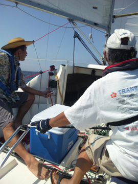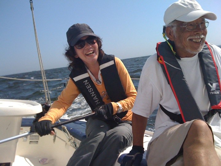 城ヶ島大橋9:36 通過〜風が心地よいが、残念ながらちょっと弱い。 4m程度。12ktを超えたらスピンを上げようと。 今回は、おまる練習デー。 仙人に「ホレッ」と言われると 流石におまるも文句を言わず、練習練習(笑) |