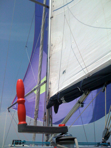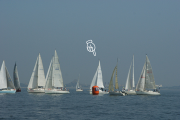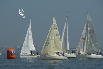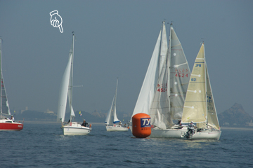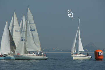 マークがかなり見えてきた辺りで 義船とすれ違いました。 ハンディ拡声器をつかった人から応援。 「がんばってるじゃーーん」・・・ 気合が抜けるからやめて〜 その後、マーク回航して、 しばらく走ってもう一度ジェネカーアップ。 |