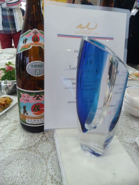 でも、フェロークラス(ケンノスケデザインじゃないやつね) 2位を発表したところで一部のひとから「アレレレレ???」の声。 そうです、、、 「フェロークラス優勝はしゃわーぼーい!!」 ってうちです〜♪ トロフィーもらうの忘れたり、伊佐美もらったり、写真撮ったり ・ ・ ・ いかん、進行が押せ押せになる、とおもいつつ。。。 優勝しちゃった♪ ケンノスケクラスは仲良しのアクアが2位だったし、ね♪ そして、パーティ後、いつものごとく、みんなで集まっておしゃべりして、 飲んで楽しく夜はふけていくのでした。 と、いっても昼過ぎにレースが終わって飲み続けていたため みなさん、22時にはダウンしてました。 |