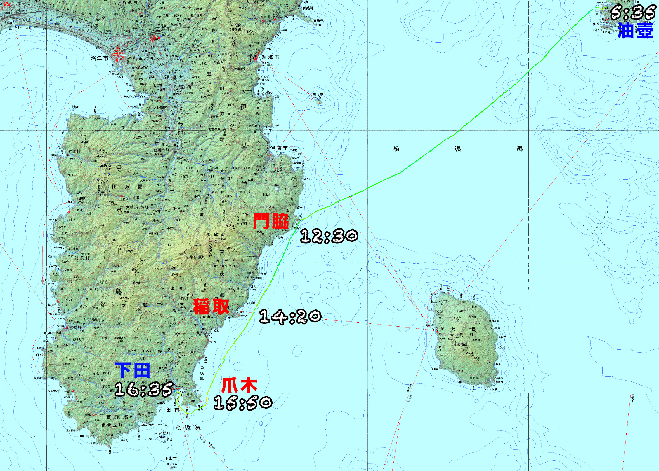 | 晴れ気温32度 風 南西 2kt (最後に12kt) 波高0.5m 乗員 3名 仙人・香田さん・私 |