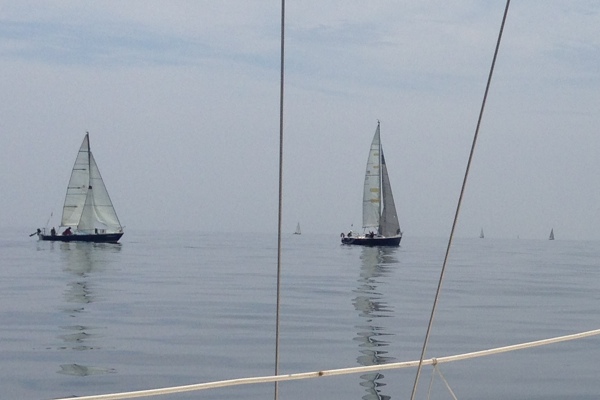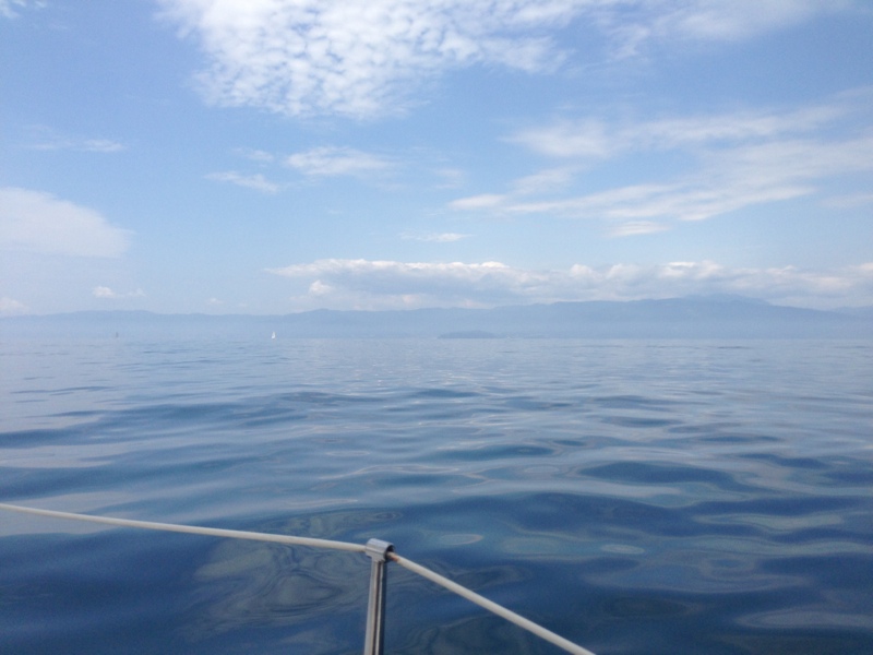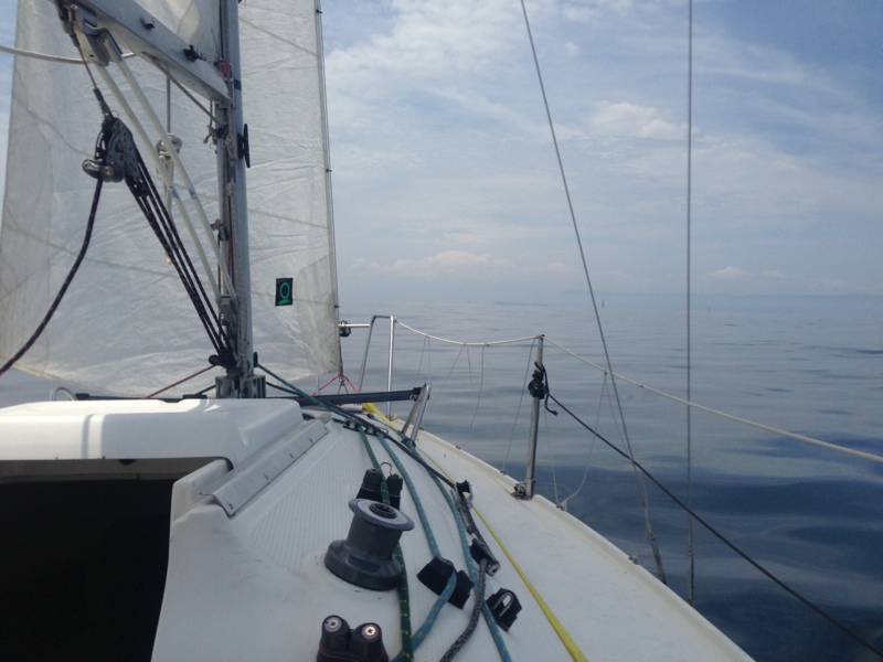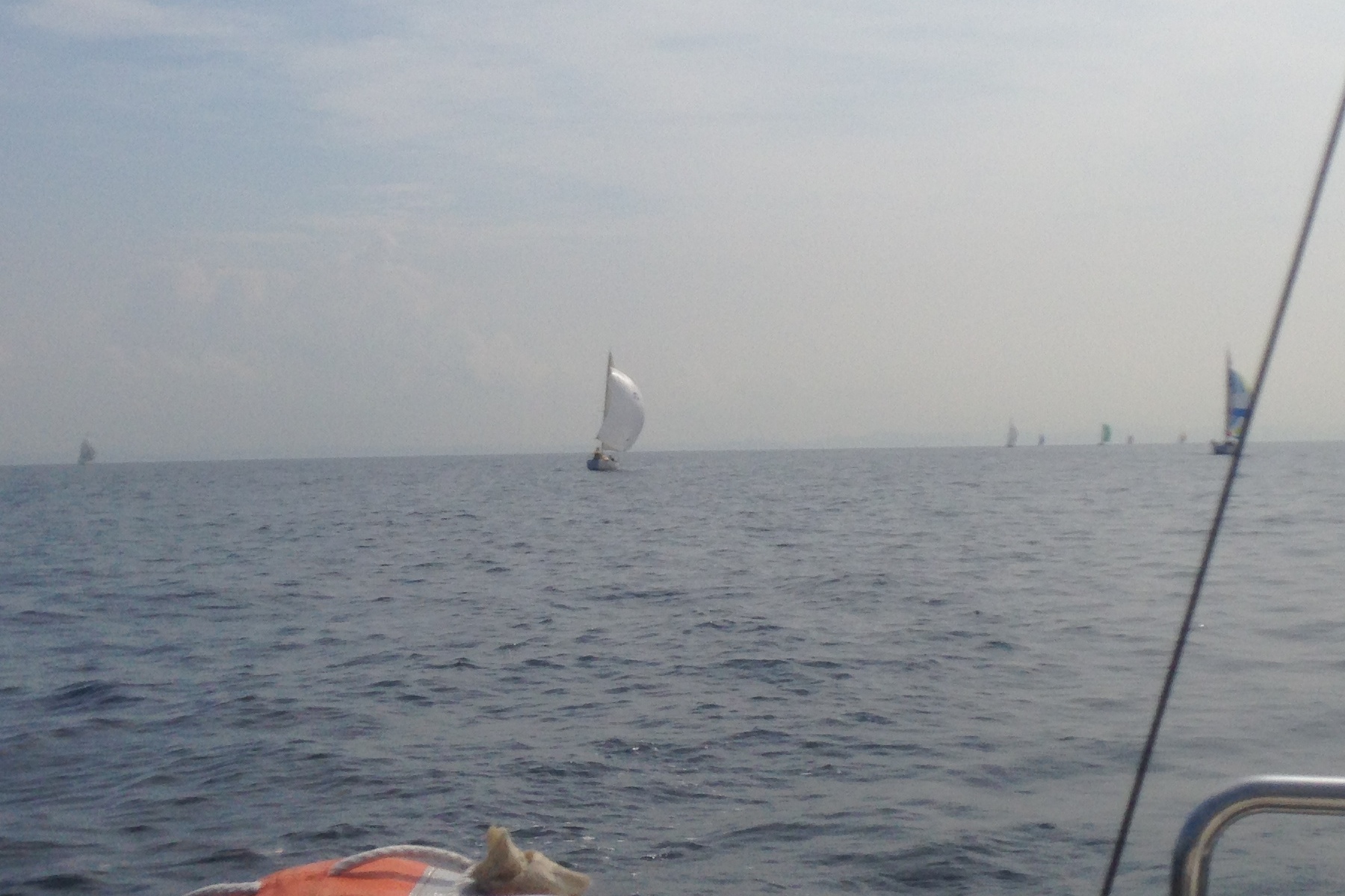 鏡のような海面 ベタ凪。無風… でも、潮で追われて 0.5〜1kt前後で 初島へ寄っていく。 |