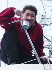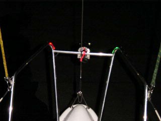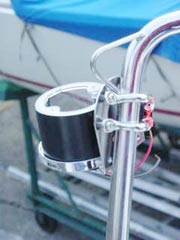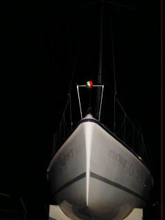| これが噂の船尾灯取り付け中。 斜めのスタンションに 付けなければならないので苦戦。 結局、細引きを使って 後はボルトとナットで固定。 |