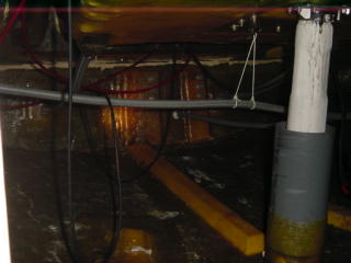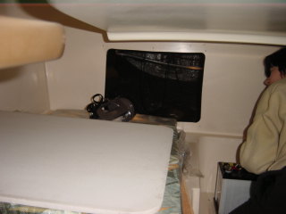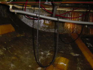 | この白い縦のが舵。 横に走っているのは座席の下のアンカーロッカーの排水管。 赤いのはエンジンのスロットル&ギア いやいや驚いた! 開けたおまるオーナーはもっと驚いていた。 (自分のベッドが作れると!?) |