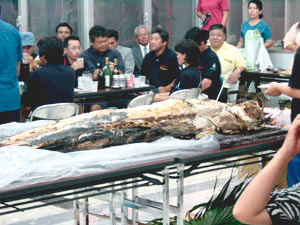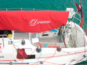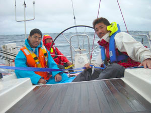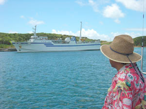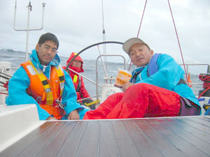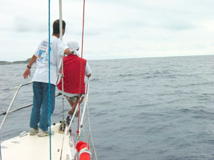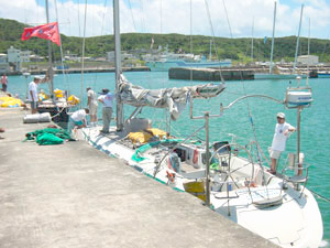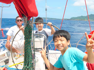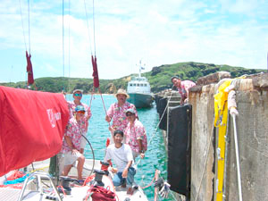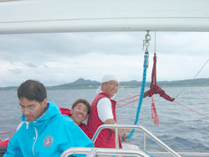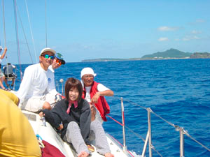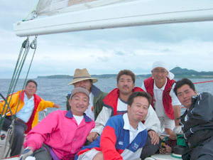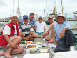| 石垣島を離れなんちゃって回航楽勝! 朝5時に某クラブの美女達が食べきれないほどの おにぎりを握って来てくれた。 その楽しい楽しい写真も優しい先輩のカメラに 入っているのだが・・・ |